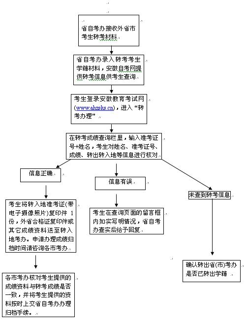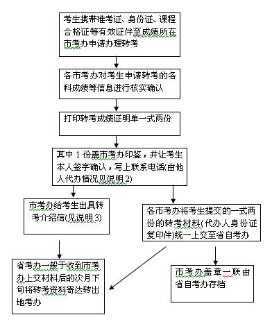 轉(zhuǎn)考:省內(nèi)轉(zhuǎn)考不需辦理轉(zhuǎn)考手續(xù);省外轉(zhuǎn)入的考生要及時與省自考辦考籍科聯(lián)系(0551-63609520),以便查對考籍檔案是否轉(zhuǎn)到;省內(nèi)轉(zhuǎn)往省外的考生,先到所在市考辦辦理轉(zhuǎn)考手續(xù),由市考辦交省考辦統(tǒng)一辦理機(jī)要郵寄手續(xù),考生個人不能郵寄或自帶考籍檔案。辦理轉(zhuǎn)考時,考生需提供身份證及復(fù)印件,全部合格證、準(zhǔn)考證,并由本人提出申請。